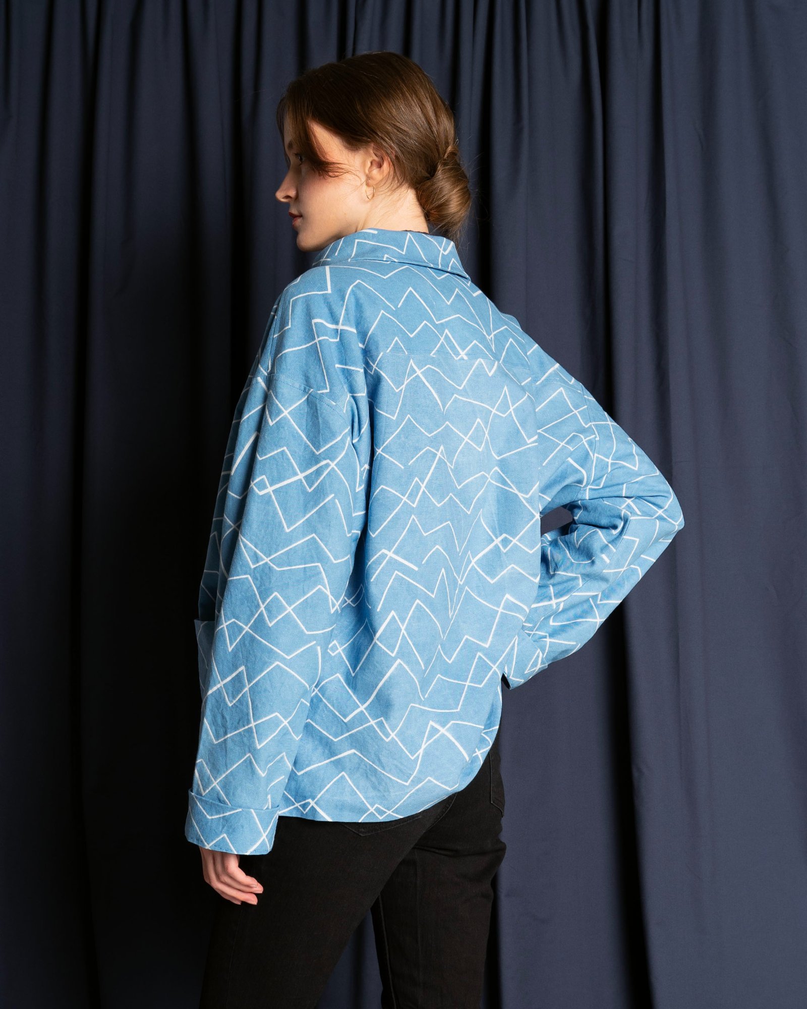 Hrubší keper tkaný na Slovensku. Flanelová podšívka. 100% bavlna. Modrotlač.
